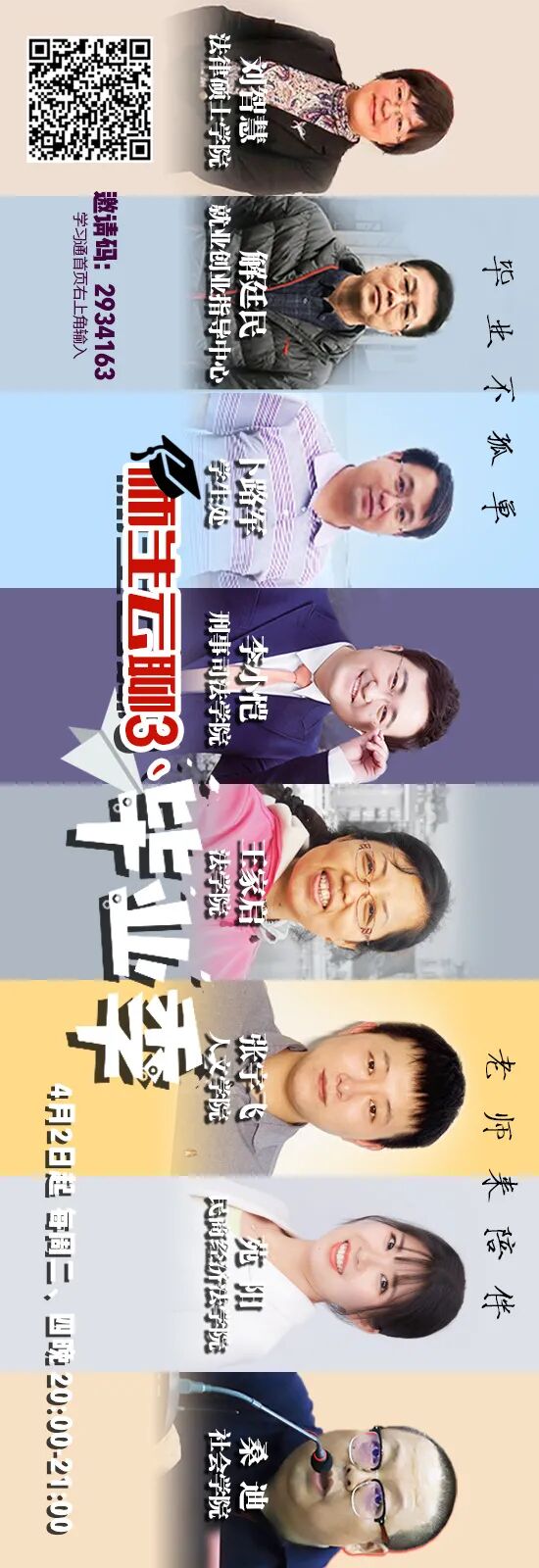 在此基础上,党委教师工作部着眼学生需求与当前热点,尤其是2020届毕业生需求,特推出“师生云聊”活动第三季·毕业专享季。活动共邀请8位嘉宾,在4月每个星期的周二、周四晚上20:00-21:00,准时开启“云端陪伴”,让我们相约每周同一时间,学习通同一邀请码“2934163”,将陪伴进行到底!